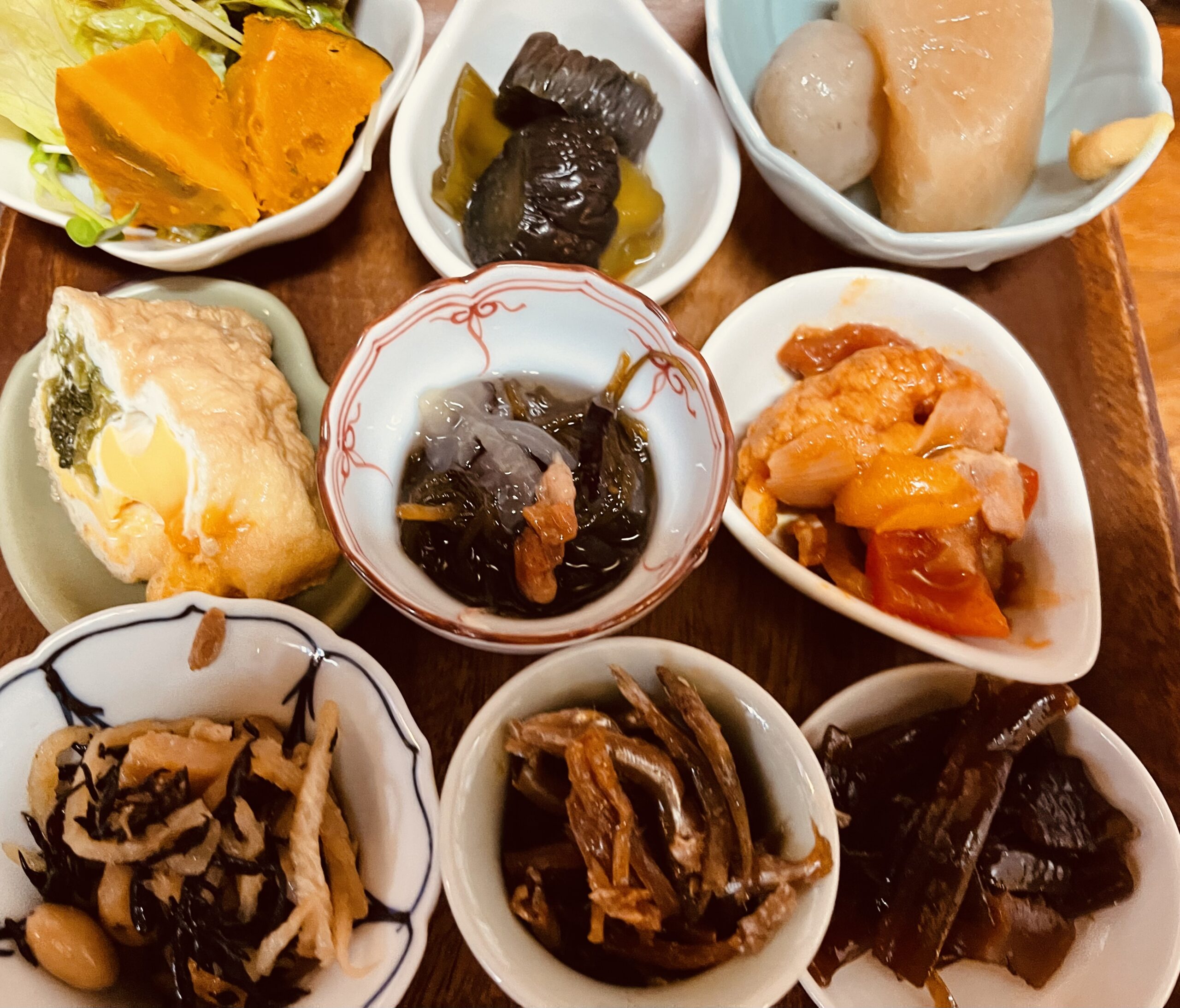 10月22日~10月25日 今週のランチ おばんざい 2025.10.27 10月22日(水) 前菜 いなり卵 クラゲともずくの酢の物 切り干し大根とひじきの煮物 茄子と甘長唐辛子の煮浸し わかさぎのくぎ煮 おでん ラタトゥイユ かぼちゃのコンソメ煮 グリーンサラダ 主菜 ベーコン巻ハンバーグ 秋刀魚の塩焼き 汁物 白菜と鶏団子の味噌汁 次へ 1234