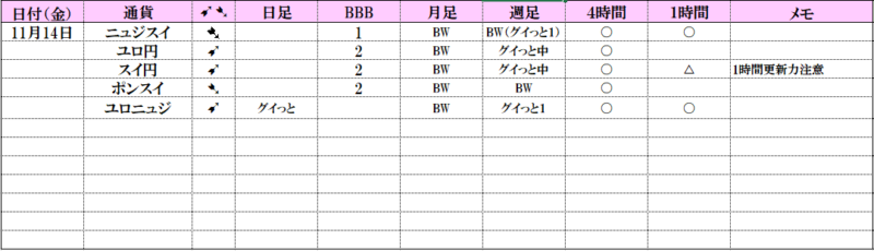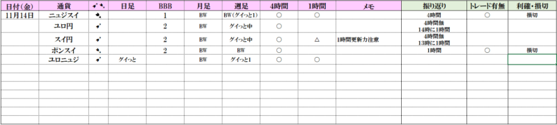 11/10~11/14 日々の記録と振り返り FX 2025.11.17 11月14日(金) 注目通貨 環境認識 ニュジスイ 上位下にBW 1時間4時間待ち ユロ円 上位上にBW 4時間待ち スイエン 上位上にBW 1時間4時間待ち ポンスイ 上位下にBW 4時間待ち ユロニュジ 上位上にBW 1時間4時間待ち 振り返り ニュジスイ ユロ円 スイ円 ポンスイ ユロニュジ 前へ 12345